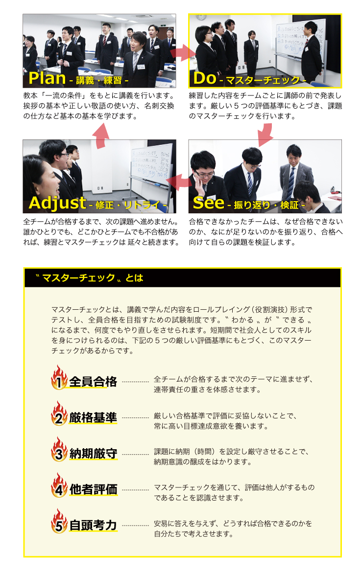 挨拶や名刺交換、電話対応など、一般的な新人研修では、講師が一方的な講義形式で教えることが多いで すが、ニューエアの新人研修では、PDSAサイクルを重視しています。あれだけ新人研修で学んできたの に、実際の現場では全然大きな声で挨拶できない、名刺交換がおぼつかない、電話に出られないなどとい うケースは少なくありません。 わかったつもり ≠ナ終わらせず、身体で覚えるレベルになるまで、何 度も何度もPDSAサイクルを繰り返します。